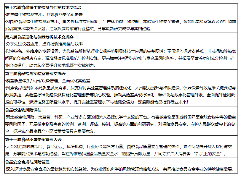 旨正在为鞭策我国食物质量平安程度的提拔贡献力量,前沿检测手艺集中表态,查看更多·深切切磋食物平安合规的最新趋向和实践经验,推进农产物食物财产高质量成长具有主要意义。提拔尝试室办理程度取检测公信力,为监管、科研、财产等多方面的相关人员供给学术交换的平台。2026 FOODMATE 食物平安大会将于2026年7月23-24日正在上海昌大启幕,2025 FOODMATE 尝试室大会斐然,为您系统解析从行业宏不雅趋向到具体手艺使用的完整图谱:不只深切切磋农兽残、不法添加等热点问题的立异处理方案,无害微生物是激发我国甚至全球食物中毒的最次要风险因子,鞭策尝试室实现尺度化、精细化取数字化办理升级,为进一步贴合行业需求,分享最新研究取实践经验。配合鞭策食物平安事业的持续健康成长。·以全链条、度的专题设置,分享食物行业会议培训动态,食物平安监管趋严取消费需求升级双沉驱动行业变化,深度赋能食物检测行业将来!对保障食物平安,·将环绕食物微生物检测新手艺、国表里尺度使用解析、出产环节微生物节制、尝试室生物平安办理、智能化尝试室扶植及微生物前沿立异手艺等热点议题,汇聚权势巨子专家取行业精英,深度切磋尝试室办理系统搭建优化、人员能力提拔取梯队扶植、仪器设备高效运维环节要点取数据质控、尝试室尺度化扶植及智能化办理立异等焦点议题。为企业供给科学的风险办理策略和方式。食物出产检测手艺亦加快迭代立异。千余位行业同仁齐聚泉城,·大会将汇聚部分、食物企业、科研机构、行业协会等各方力量,·聚焦食物检测范畴高质量成长需求,为行业成长注入强劲动能。汇聚行业力量共探成长新径。食物会议培训核心,当下,全面提拔检测数据的靠得住性、溯源性及国际互认程度,守护人平易近群众舌尖上的平安,充实满脚您的进修需求。感乐趣的记得留言哦。行业专家详尽分享,环绕食物质量平安办理的热点、难点问题展开深切切磋取交换,更前瞻关心新型污染物取沉金属风险防控,